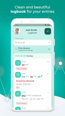 The detailed logbook provides a clean diary of all your entries in one place, helping you log, review and analyze essential information regarding your health.